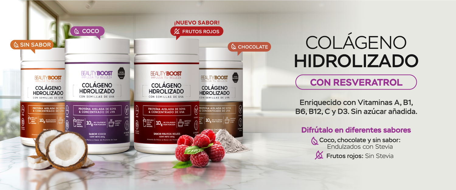 Colágeno Hidrolizado enriquecido con Resveratrol, Vitamina C, Biotina, Vitamina A, Vitamina D, Vitamina B1, B6 Y B12.