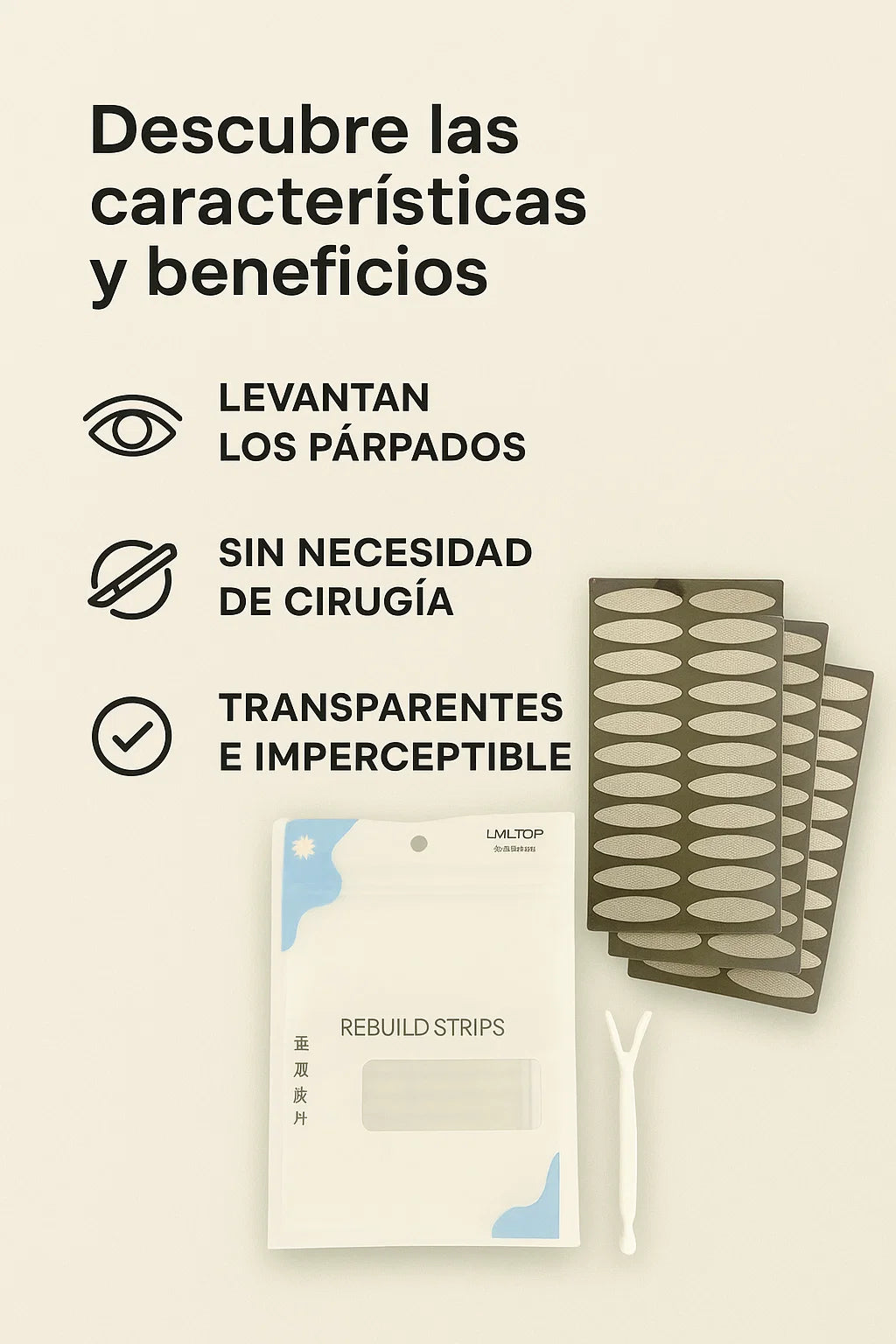 Despierta tu mirada con nuestras tiras realzadorás EyeLift© que han sido diseñadas bajo la premisa de revitalizar tu mirada, pudiendo lucir un rostro con aspecto fresco y juvenil, son totalmente discretas y se pueden maquillar, resistiendo agua y sudor.